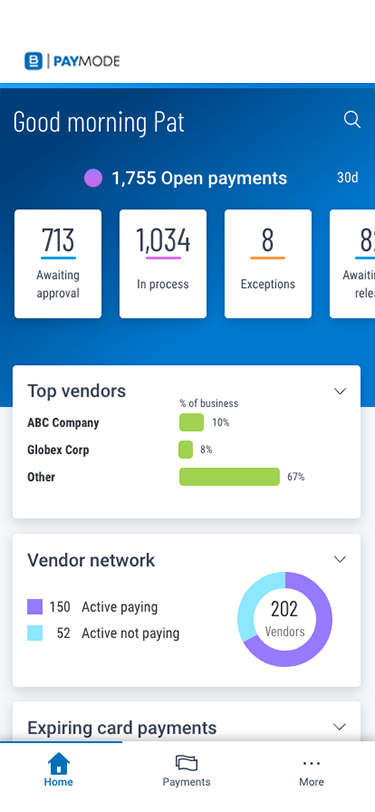 Securely pay your vendors or receive digital payments through our network of over 550,000 businesses. With more than $500 billion in payments processed annually with zero fraud, Paymode utilizes sophisticated detection strategies to prevent Business Email Compromise and identify imposter vendors.