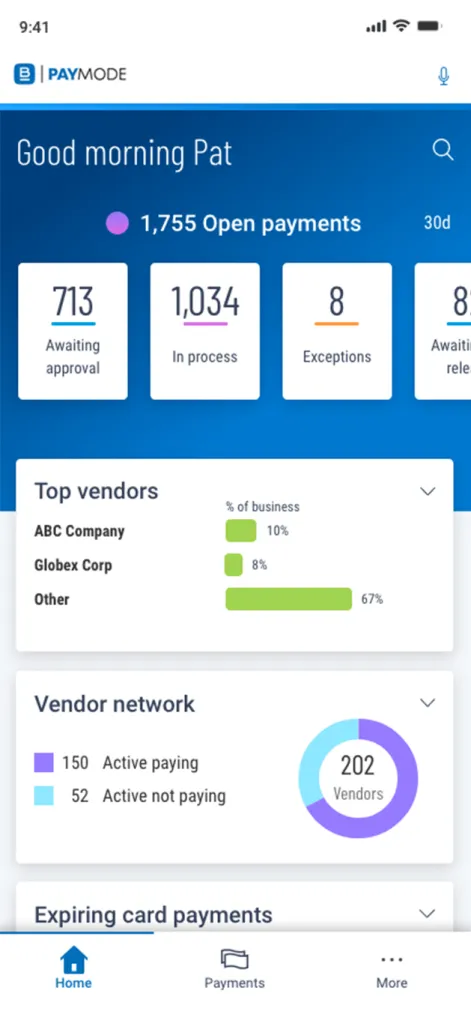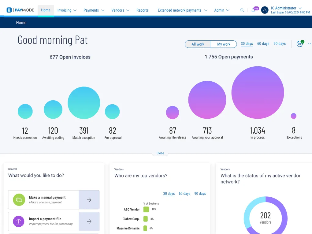Use interactive analytics dashboards and real-time reporting to track invoice and payments KPIs, like matching statistics, processing time, and the size of your supplier network on Paymode. You can also see: