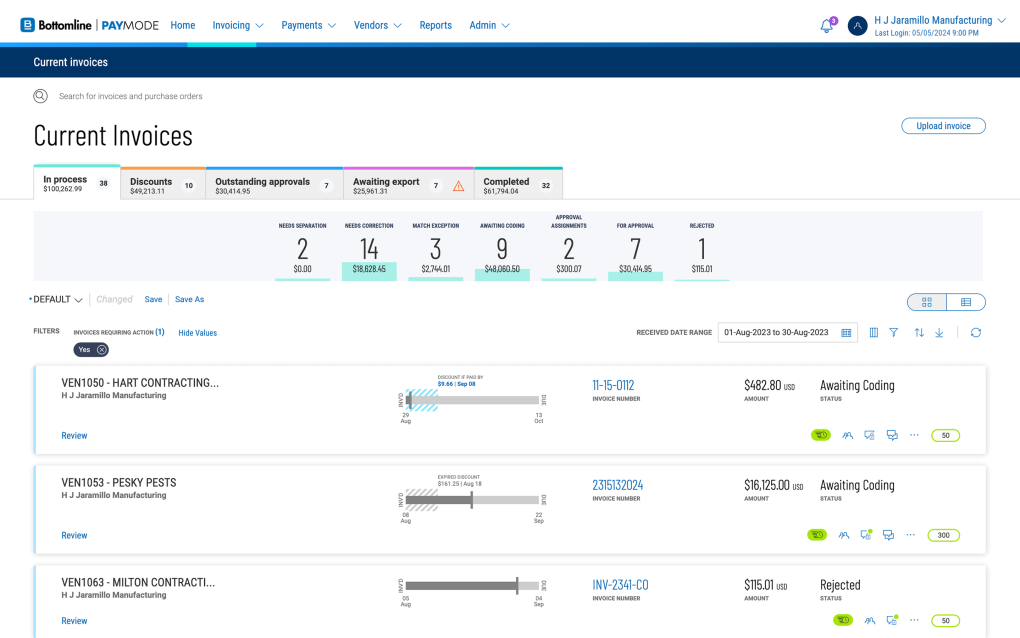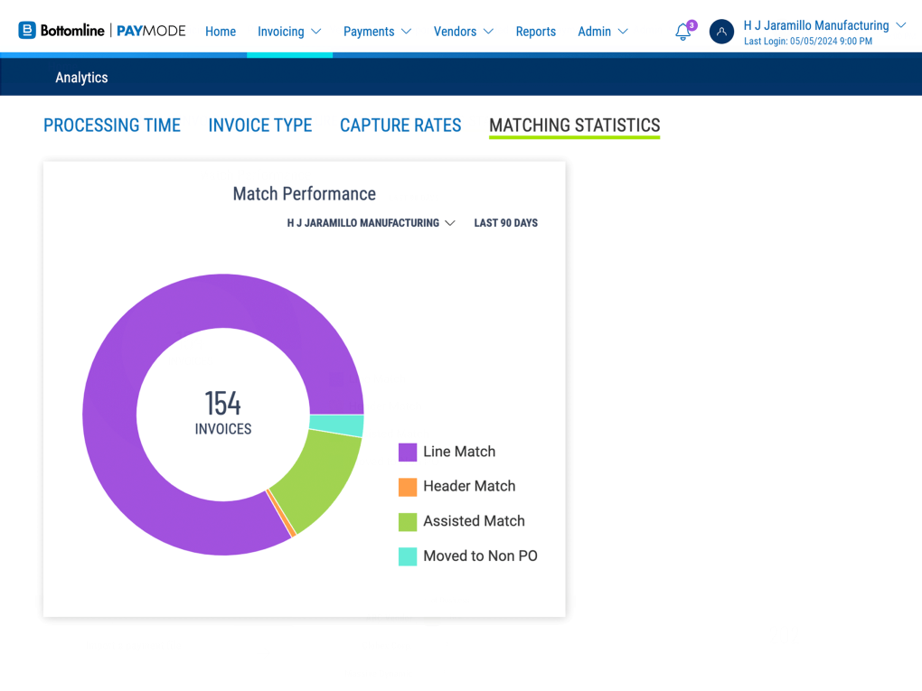 Track invoice matching statistics, processing time, and vendor network size within Paymode using interactive analytics dashboards and real-time reporting. You can also see: