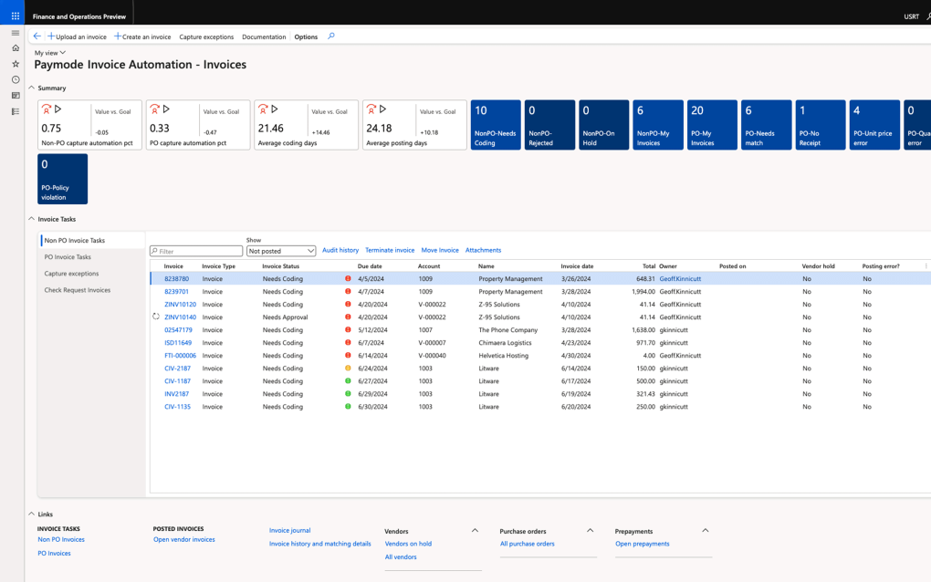 Replace your manual processes with a completely automated invoicing solution delivered within Dynamics 365 to extend the capabilities of your ERP significantly. Best of all, your ERP users continue to work within their familiar Dynamics 365 for Finance workspace. Invoice Automation for Dynamics 365 provides AP departments with enhanced automation, governance, and operational visibility around PO and non-PO invoice processing.