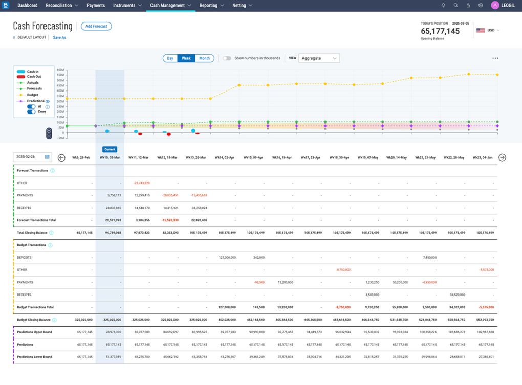 Bottomline’s Global Cash Management Hub automatically syncs with all your banks, bank accounts, and financial instruments, providing a singular view of your total cash. The cash flow forecasting module pulls in data from your accounting and financial systems, sales platforms, and ERPs to show all expected cash inflows and outflows for your business over a specific period. No more forecasting with spreadsheets and disparate systems.